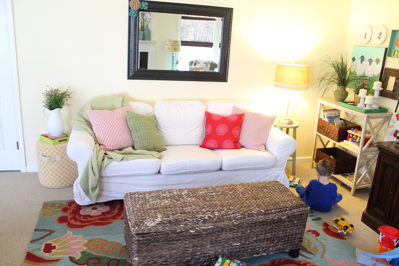 The backdrop for this room is a buttery-yellow, Behr paint in Provence Cream. In a bass-ackwards move, the bold patterned area rug is actually the last element added to the room. A smarter decorator would have made that the starting point.